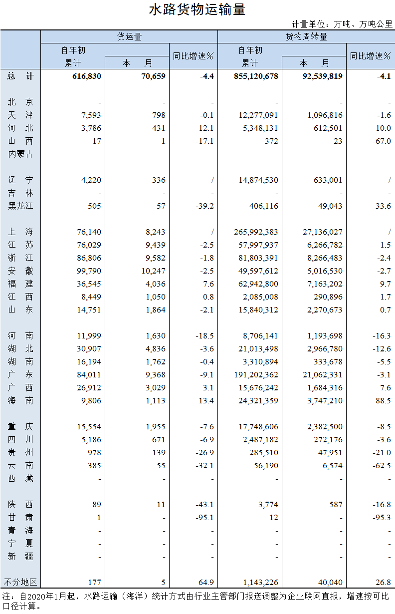 2020年10月水路货物运输量