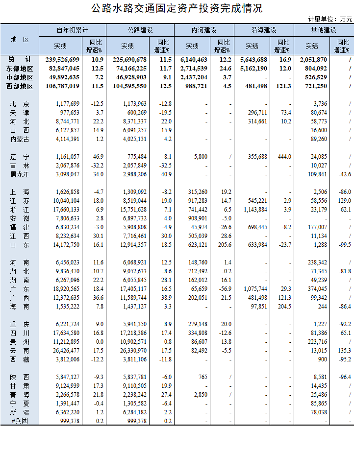 2020年1-11月公路水路交通固定资产投资完成情况