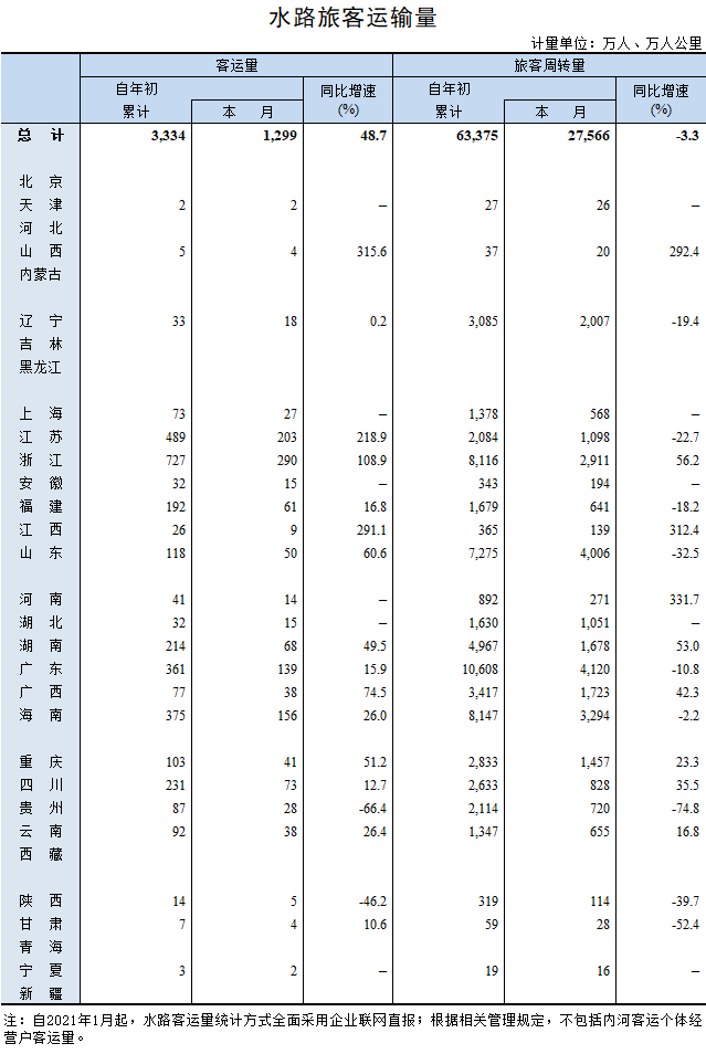 2021年3月水路旅客运输量