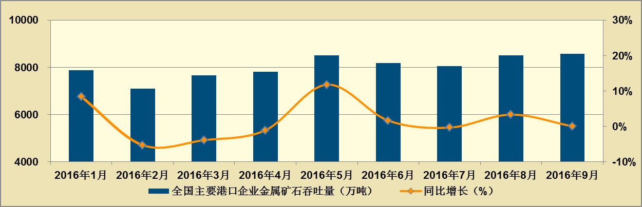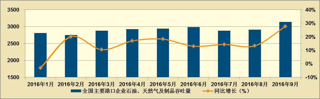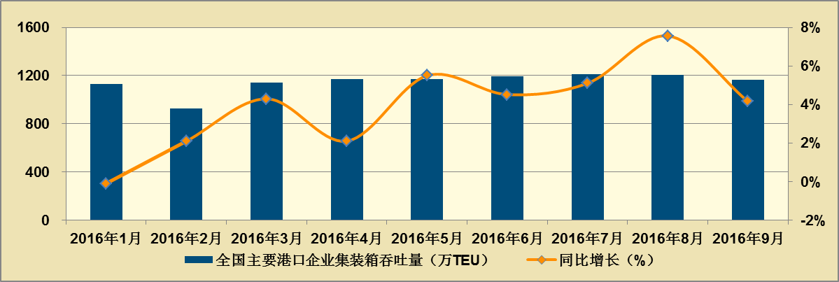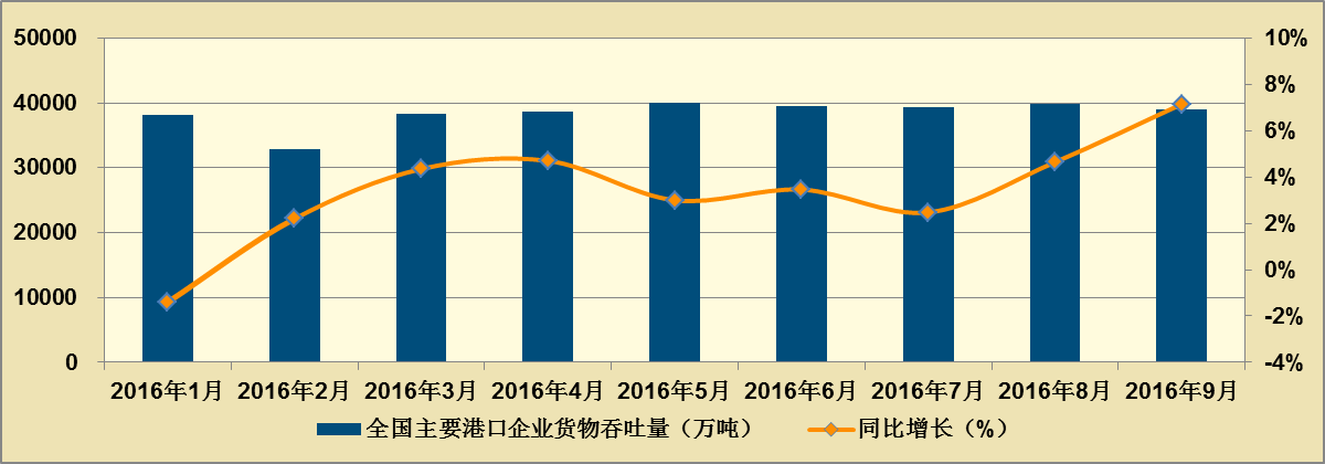 2016年9月份,全国主要港口企业生产运行总体平稳。货物吞吐量稳步增长、集装箱吞吐量增速略有下滑。