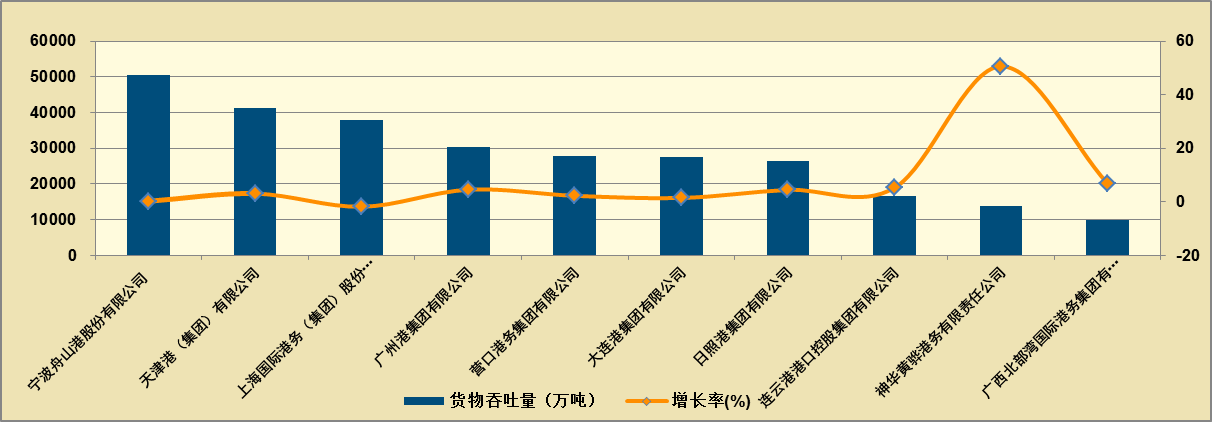 具体来看,1-9月份,排名前十的港口企业中,除上港集团累计完成货物吞吐量略微下降外,其余港口企业累计完成货物吞吐量均维持增长的态势。神华黄骅港务有限责任公司累计完成货物吞吐量增速高达50.6%。