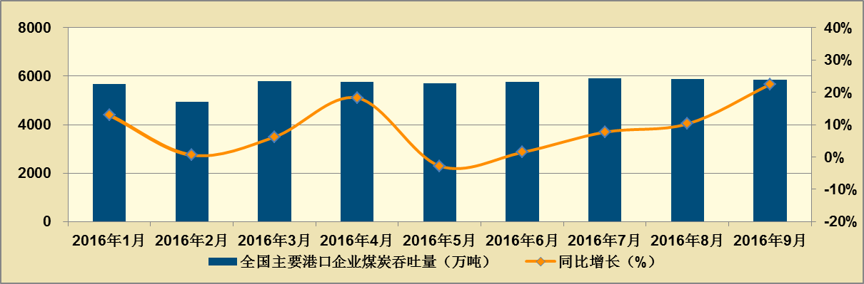 我国主要港口企业煤炭吞吐量保持稳定的水平,但其增速继续上升,上升的主要原因是去年北方煤炭港口受天津港“8·12”事件的影响,基数较低。9月份,我国主要港口企业完成煤炭吞吐量5845万吨,环比下降0.6%,同比增长22.5%,如图5所示;1-9月份,主要港口企业完成煤炭吞吐量51532万吨,同比增长8.2%。