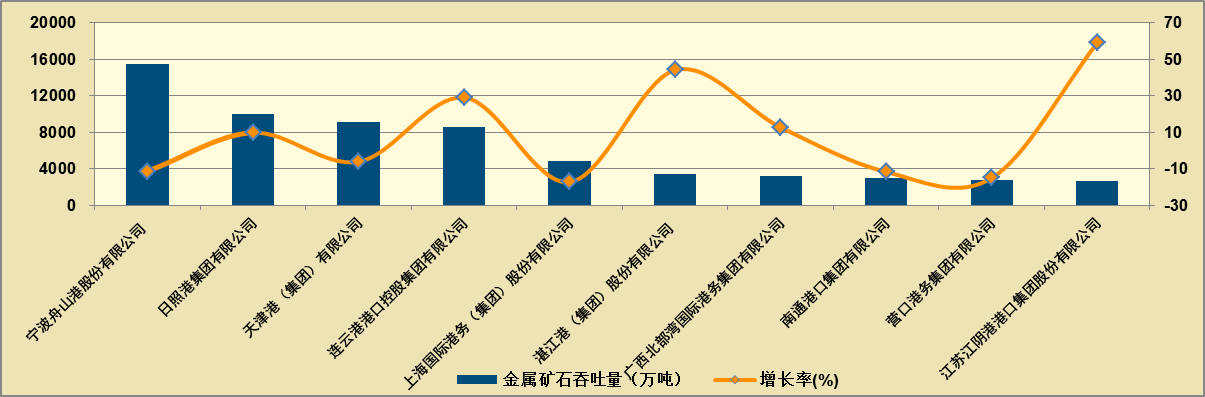 图8 1-9月份主要港口企业金属矿石吞吐量排名及增速