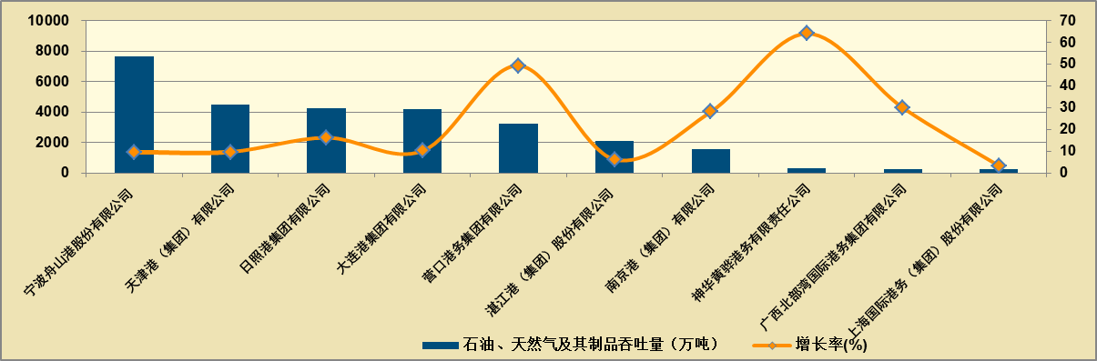 图10 1-9月份主要港口企业石油、天然气及制品吞吐量排名及增速