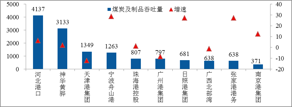 图3 1-2月煤炭及制品吞吐量排名及增长情况