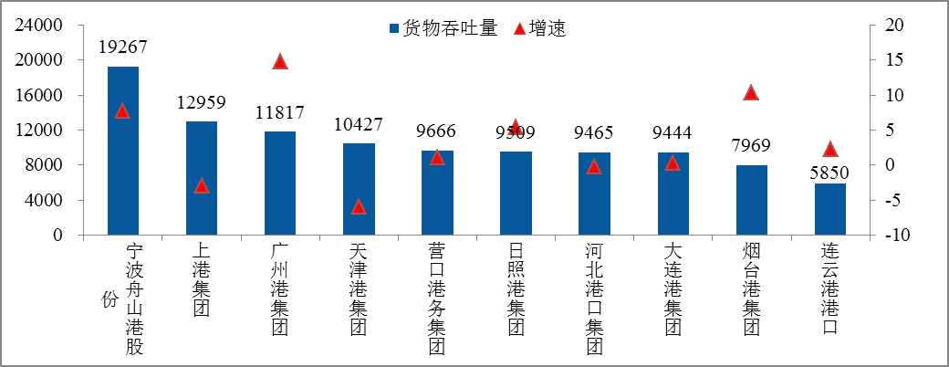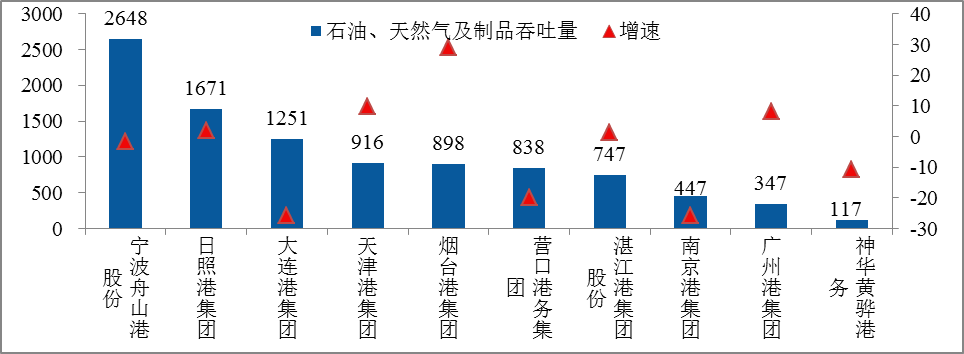 图5 一季度石油、天然气及制品吞吐量排名及增长情况