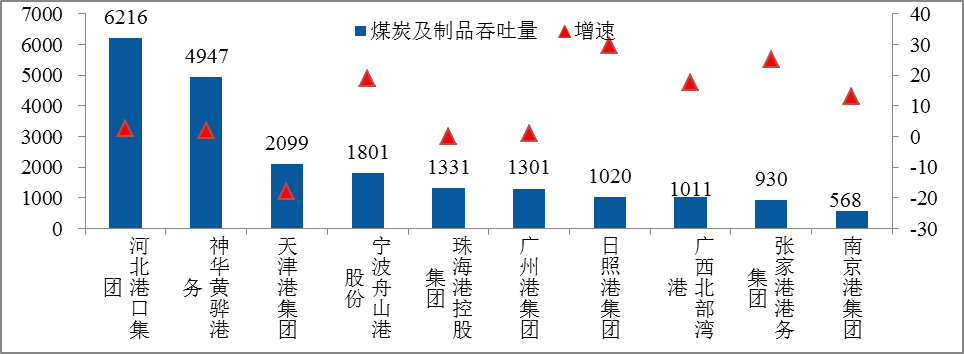 图3 一季度煤炭及制品吞吐量排名及增长情况