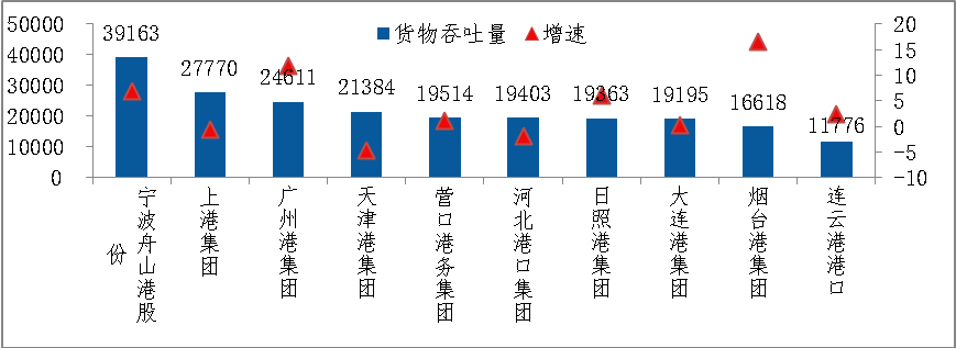 图1 上半年港口企业货物吞吐量排名及增长情况