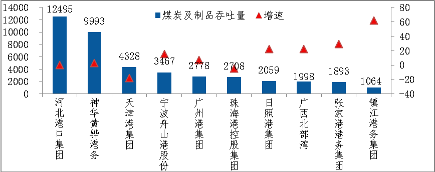 图3 上半年港口企业煤炭及制品吞吐量排名及增长情况