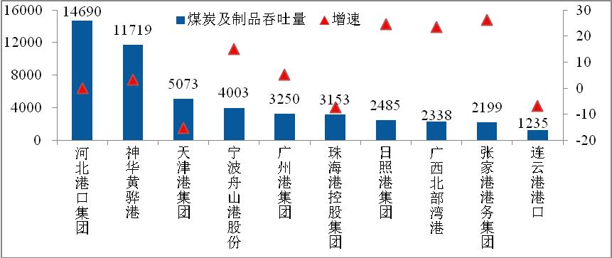 图3 2018年1-7月港口企业煤炭及制品吞吐量排名及增长情况