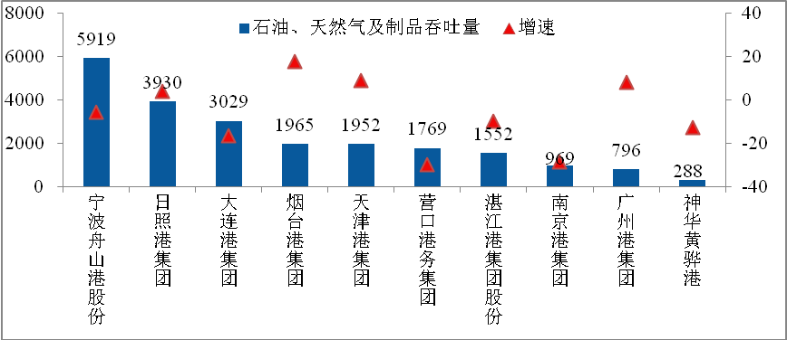图5 2018年1-7月港口企业石油、天然气及制品吞吐量排名及增长情况