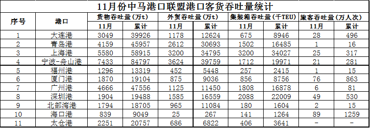 2016年11月份中马港口联盟港口客货吞吐量统计