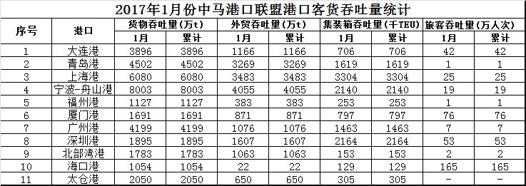 2017年1月份中马港口联盟港口客货吞吐量统计