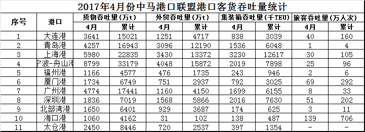 2017年4月份中马港口联盟港口客货吞吐量统计