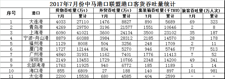 2017年7月份中马港口联盟港口客货吞吐量统计