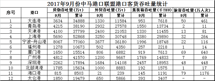 2017年9月份中马港口联盟港口客货吞吐量统计