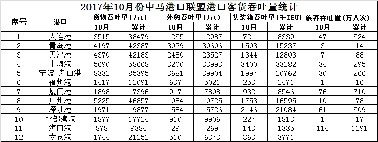2017年10月份中马港口联盟港口客货吞吐量统计