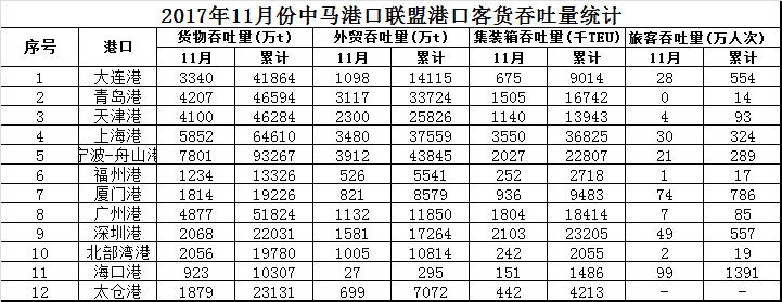 2017年11月份中马港口联盟港口客货吞吐量统计