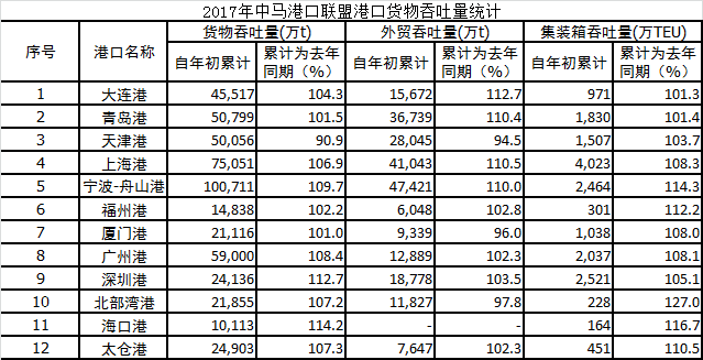 2017年中马港口联盟港口货物吞吐量统计