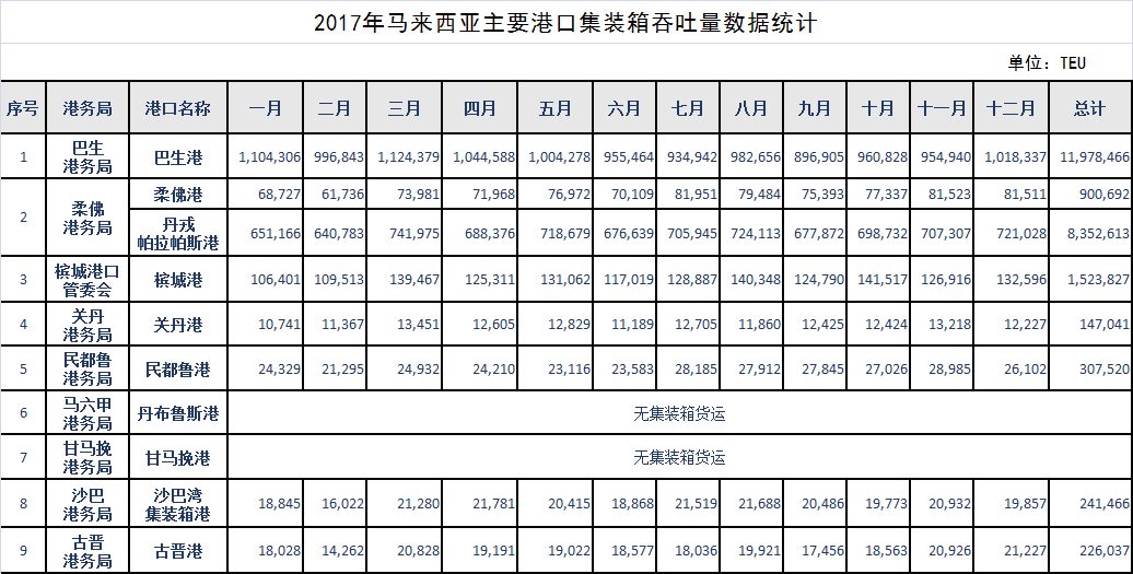 2017年马来西亚主要港口集装箱吞吐量数据统计