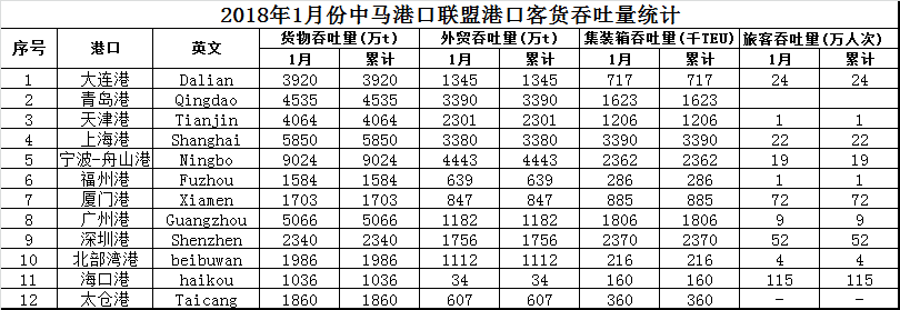 2018年1月份中马港口联盟港口客货吞吐量统计
