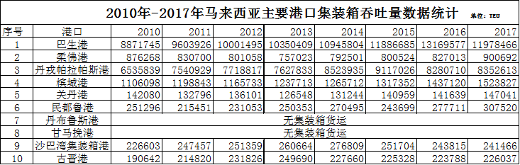 2010-2017年马来西亚主要港口集装箱吞吐量数据统计