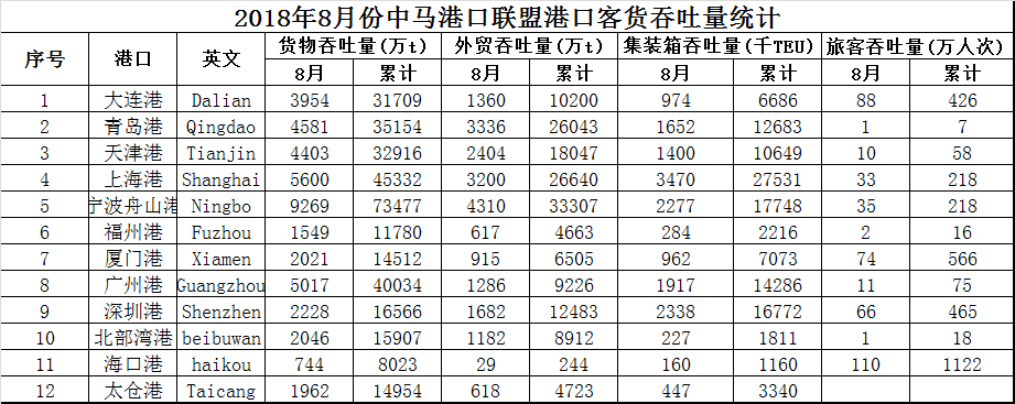 2018年8月份中马港口联盟港口客货吞吐量统计