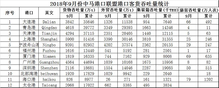 2018年9月份中马港口联盟港口客货吞吐量统计