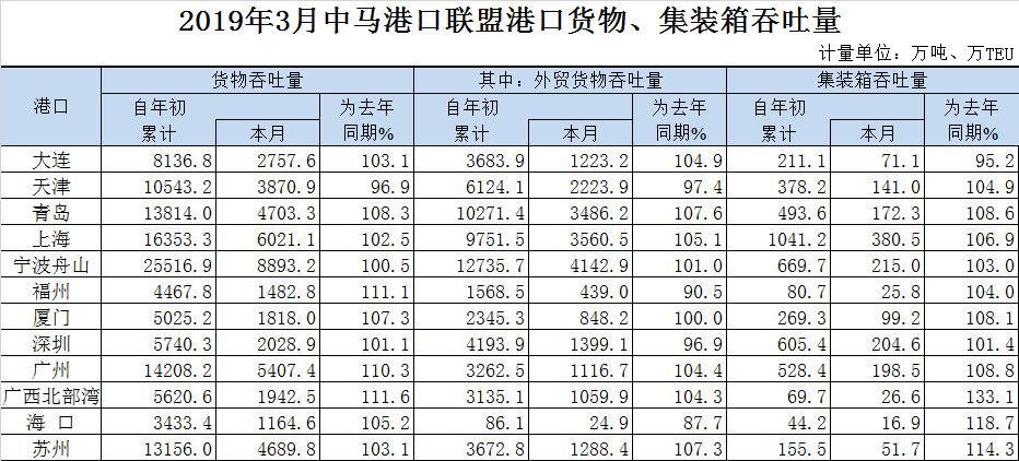 2019年3月份中马港口联盟港口货物、集装箱吞吐量统计