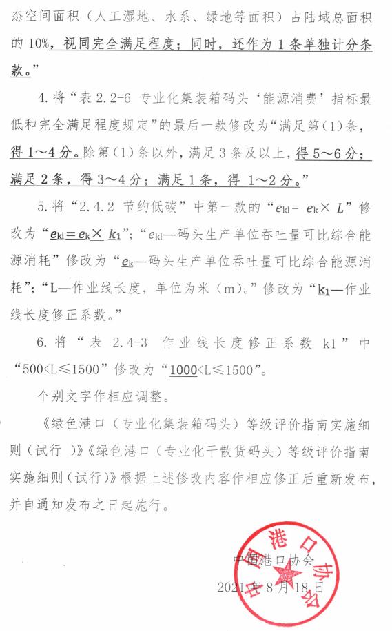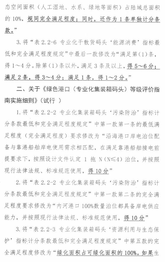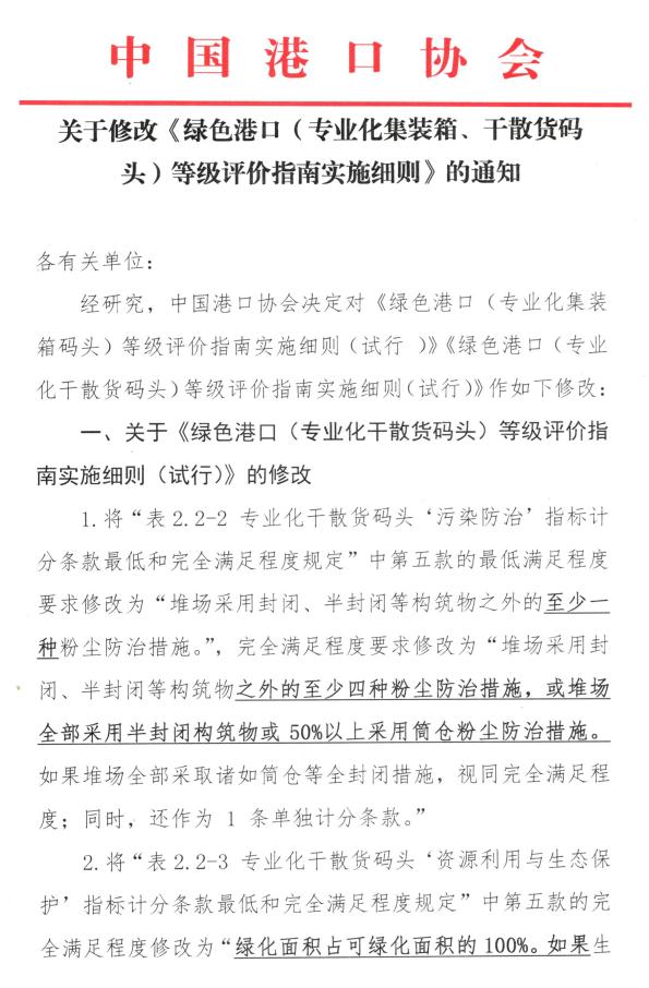 关于修改《绿色港口(专业化集装箱、干散货码头)等级评价指南实施细则》的通知