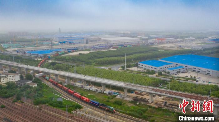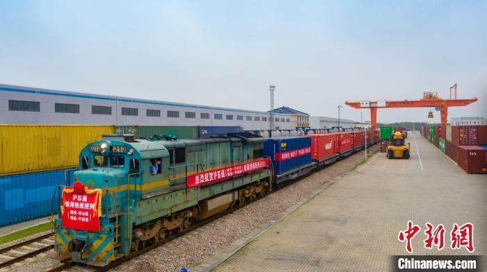 中新网南京7月10日电 (记者 朱晓颖 通讯员 胡晓炜 谢田)10日,一列满载工业机械、家具、体育用品的海铁联运班列从江苏海安物流基地驶出,前往上海芦潮港。本次开行的海铁联运班列,是首次经由沪苏通铁路抵达上海芦潮港。