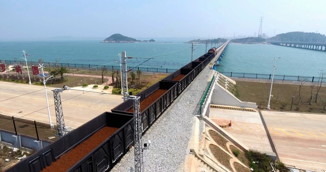 6月18日,满载进口铁矿石的“和谐”号火车沿着湄洲湾港口铁路罗屿支线缓缓驶出罗屿作业区,前往湖南。这是湄洲湾首次通过海铁联运方式向湖南地区提供铁矿石物流服务,标志着海铁联运业务正式延伸到湖南,实现了湄洲湾港大宗货物走江西进湖南的新突破。