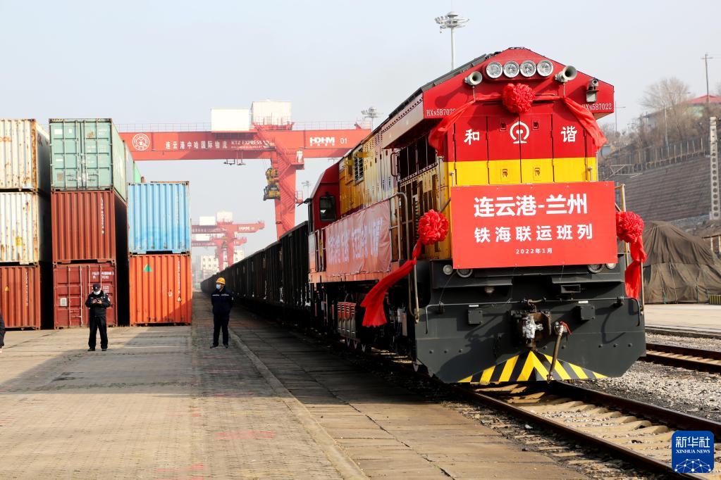1月15日,连云港发往兰州的铁海联运班列在连云港中哈物流基地准备发车。新华社发(王春 摄)