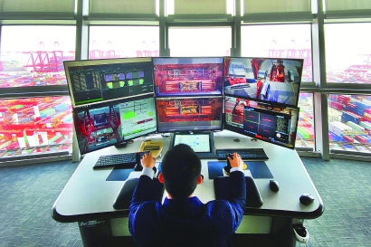 过去,操作工人坐在50米高空的桥吊控制室,俯身向下操作集装箱,工作环境艰苦。现在,洋山四期实现了自动化远程操控,操作员可安坐在控制室里,只需根据屏幕显示的实时信息,远程按动按钮或推动手柄即可。“可以说,自动化改变了工作环境,让码头工人从‘蓝领’变成了‘准白领’。”上港集团副总裁方怀瑾介绍,目前的设备规模和作业量,如按传统码头运营管理,洋山四期至少需配备700多名工人;现在,整个码头直接参与设备远程操作的只有100多人。