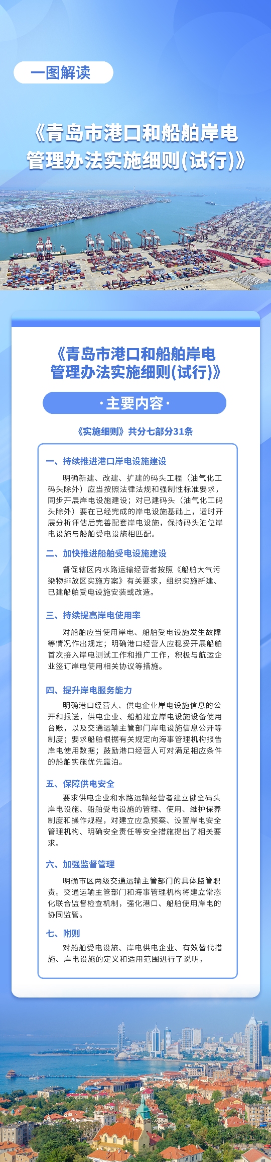 青岛日报社/观海新闻9月12日讯 为规范岸电使用和管理,加快打造世界领先的智慧绿色平安港口,近期,青岛市交通运输局与青岛海事局、董家口海事局联合发布了《青岛市港口和船舶岸电管理办法实施细则(试行)》。细则共七部分三十一条,在推进岸电设施建设、加强服务能力、提高岸电使用率、保障供电安全等方面进行了详细规定。