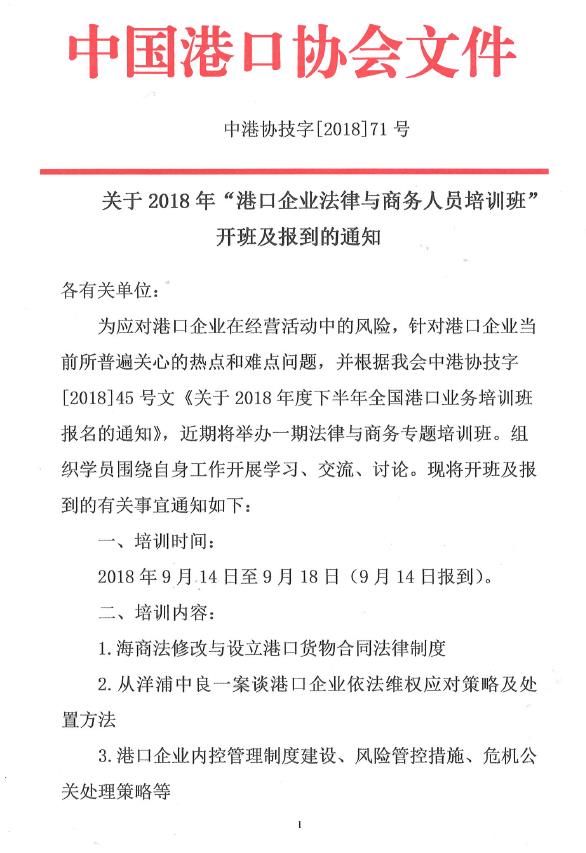 电子版通知下载:关于2018年“港口企业法律与商务人员培训班”开班及报到的通知.pdf