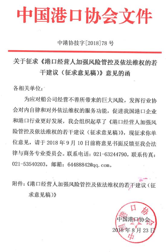 电子版通知下载:关于征求《港口经营人加强风险管控及依法维权的若干建议(征求意见稿)》意见的函.PDF