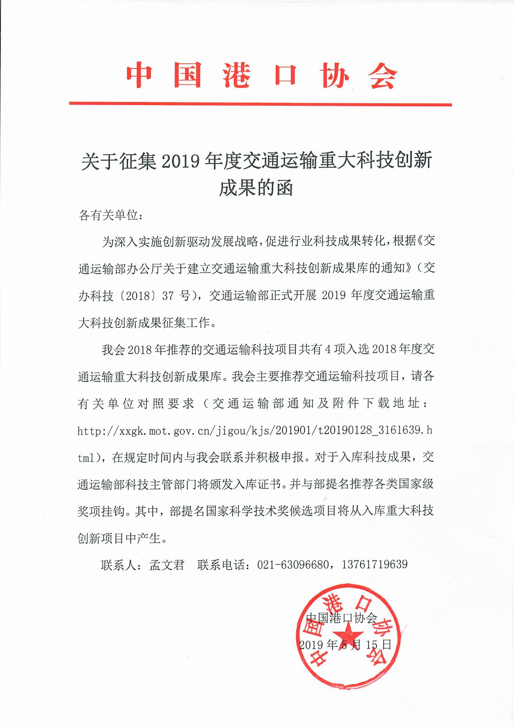 关于征集2019年度交通运输重大科技创新成果的函