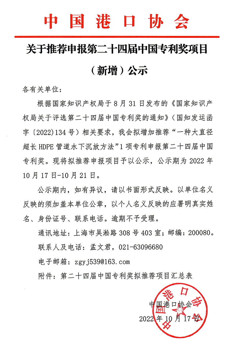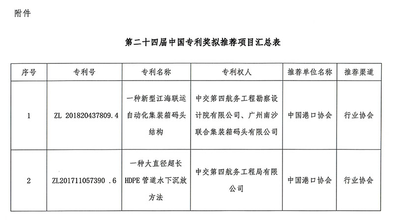 关于推荐申报第二十四届中国专利奖项目(新增)公示