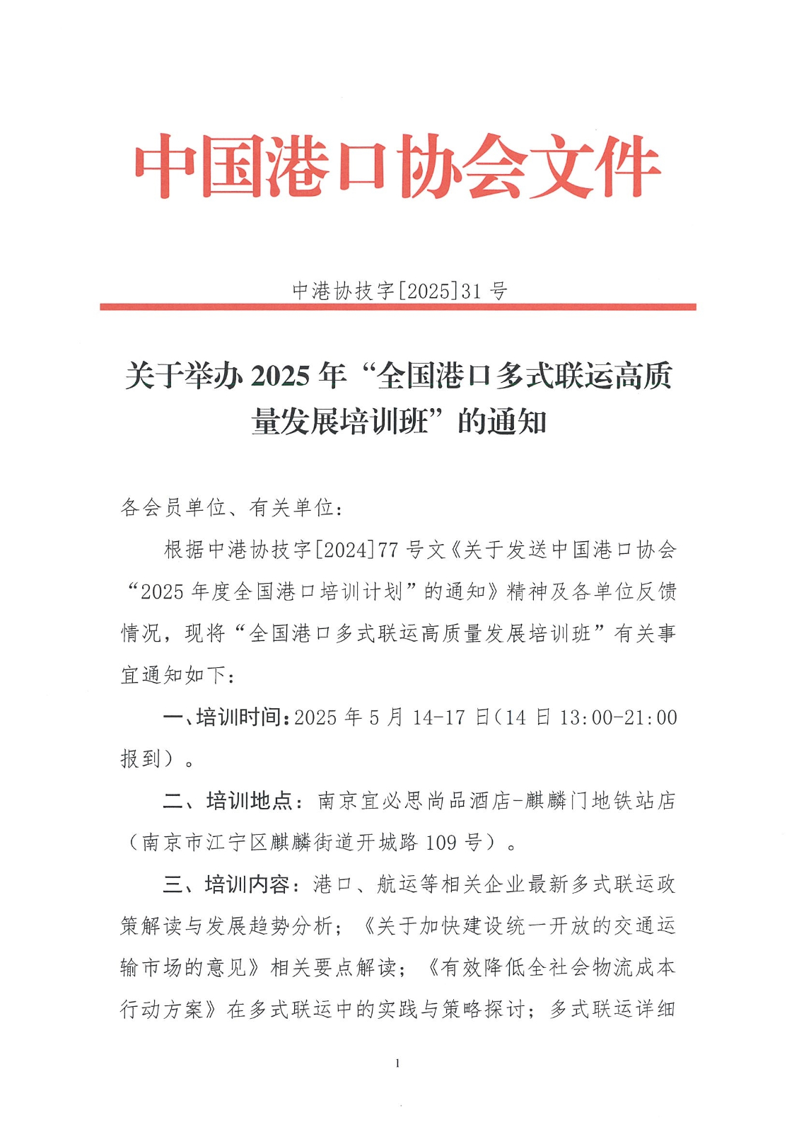 关于举办2025年“全国港口多式联运高质量发展培训班”的通知